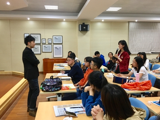 讲座中,周丁益结合自己参加各大演讲比赛、国际交流活动及开展演讲培训的经历,详实地介绍了英语演讲立意定题的技巧,指出一些常见的误区。他还以外研社杯演讲比赛的一道即兴演讲题目为例,进行现场训练和互动,并且详细回答了同学们提出的有关英语演讲方面的问题。