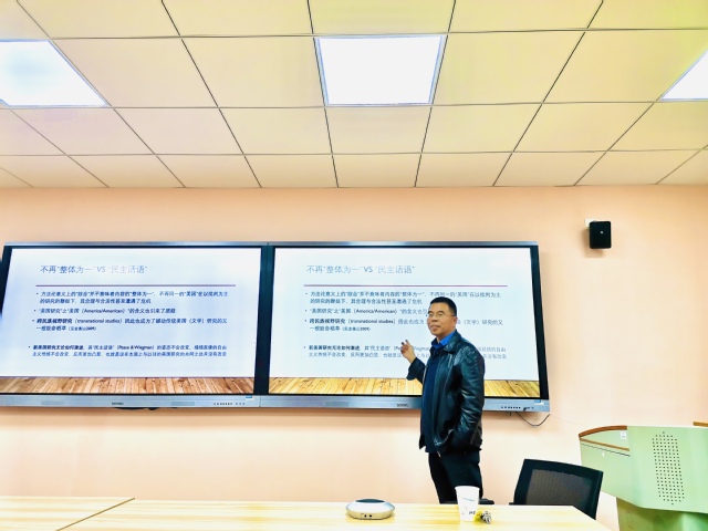 讲座伊始,金衡山介绍了美国研究诞生的时代背景,阐述了包括美国社会运动、大众媒体、神话故事以及后来发展的非裔、亚裔美国研究等在内的“新”“旧”两大主题。他指出,美国研究早期的两次重要转向:以1945年的“富布莱特”国际教育交流项目为标志的“向外转”;以美国思想、文化、历史、文学和政治为研究对象的专著陆续涌现为代表的“向内转”。同时,他列举了《美国政治传统及其缔造者》《美利坚文学史》《处女地:作为象征和神话的美国西部》等代表作。