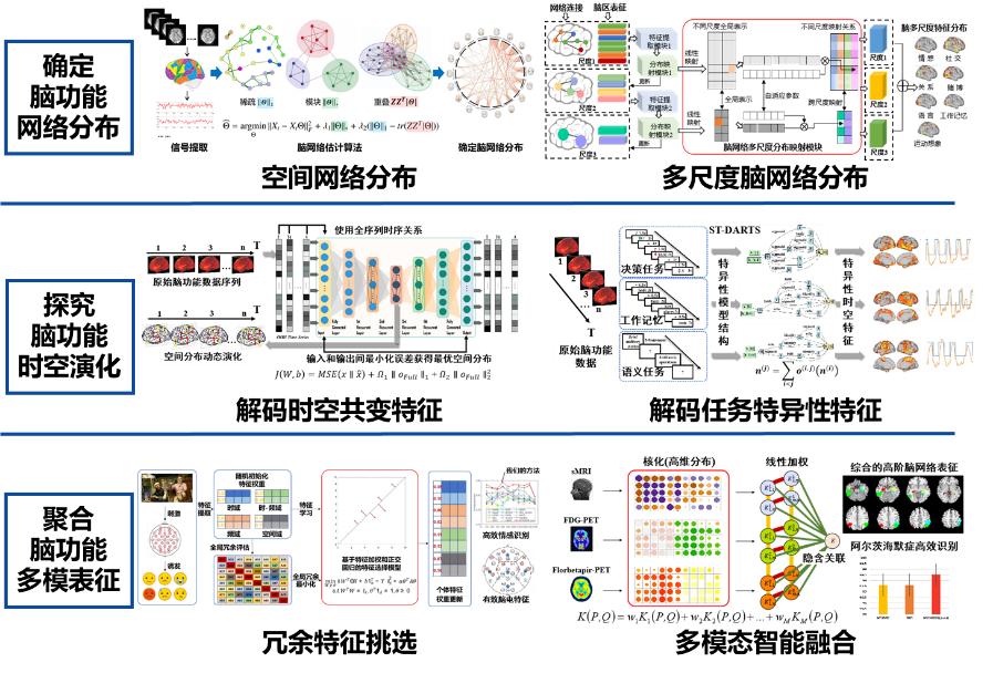 确定脑功能网络分布,空间网络分布、多尺度脑网络分布;探究脑功能时空演化,解码时空共变特征,解码任务特异性特征;聚合脑功能多模表征,冗余特征挑选,多模态智能融合。