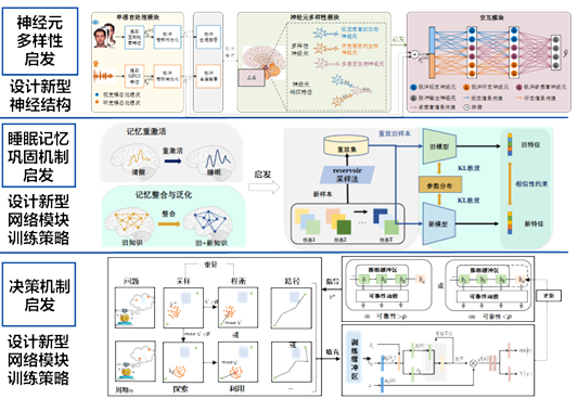 由神经元多样性启发,设计新型神经结构;由睡眠记忆巩固机制启发,设计新型网络模块训练策略;由决策机制启发,设计新型网络模块训练策略