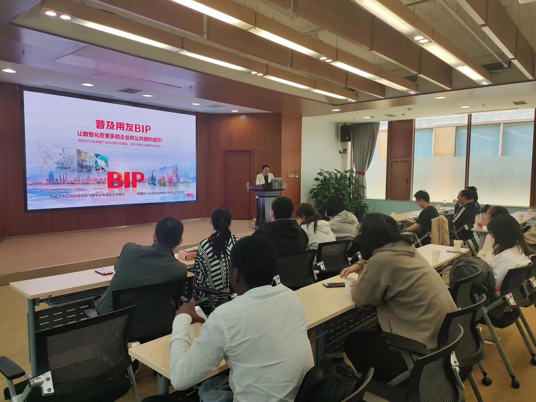 师生团队首先在用友集团工作人员的带领下参观了用友产业园,对于园内功能分区,员工福利等有了大致了解。在交流座谈环节中,用友集团人力资源部招聘COE、校招经理杜静静首先以《企业数智化 用友BIP》为主题向师生团队进行介绍,分别从公司使命、最新发展、核心产品、客户价值等角度对用友集团进行了介绍。用友集团人力资源部雇主品牌经理赵金凤介绍了用友集团的校招情况,从校招批次、薪酬体系、成长培训、发展体系、企业文化、激励机制和实习生计划多个方面进行了详细介绍。在交流环节中,针对同学们所关心的员工宿舍、落户机制、大模型布局等问题,双方进行了深入交流。