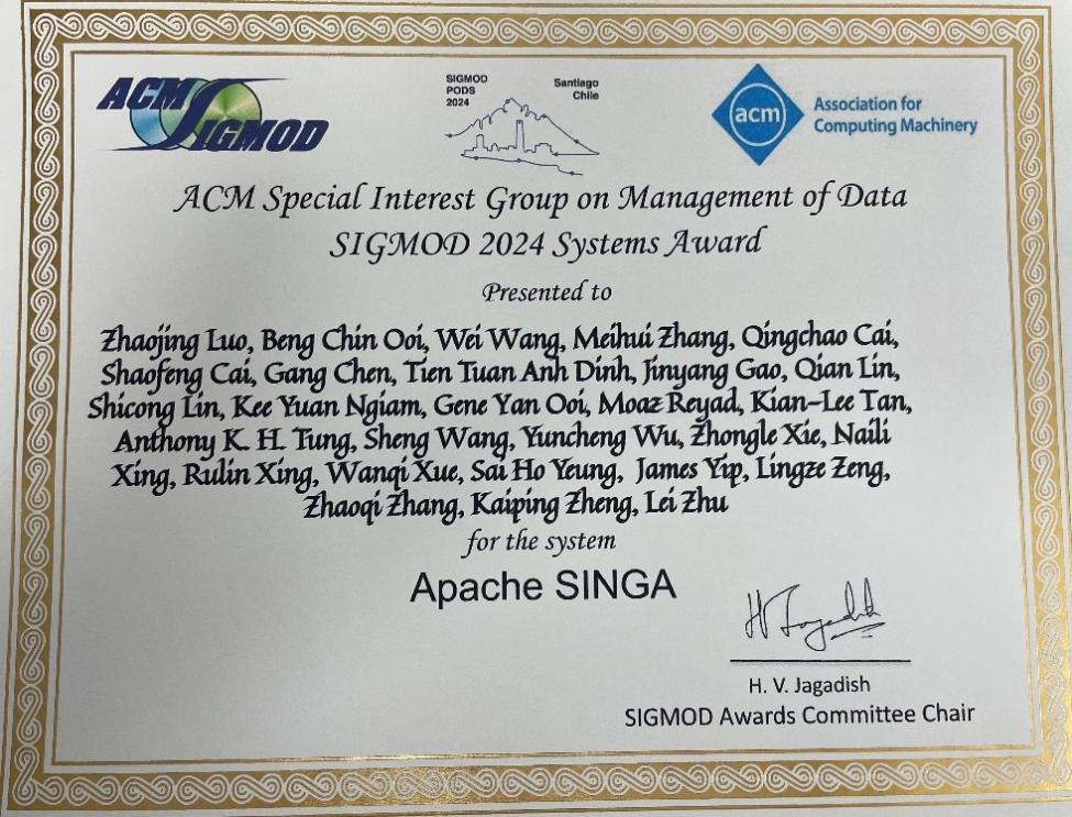 6月9日到6月15日于智利圣地亚哥召开的ACM SIGMOD 2024会议上,国际计算机学会(ACM)宣布将2024年ACM SIGMOD Systems Award授予Apache SINGA项目研发团队,以表彰其在研发分布式、高效、可扩展且易于使用的深度学习平台以用于大规模数据分析方面的贡献。主要获奖人员包括我校今年会官网教授张美慧、罗兆经。
